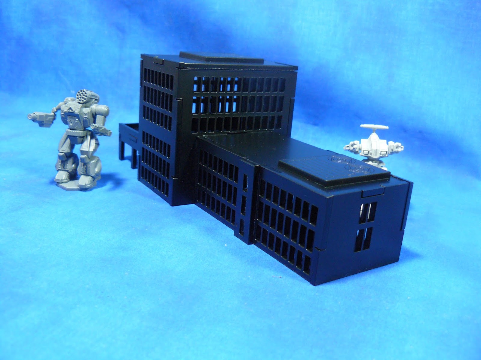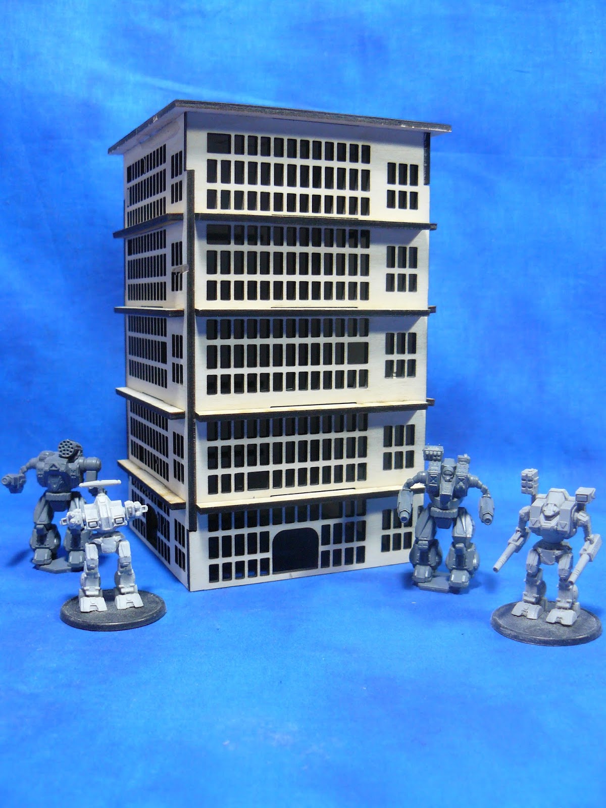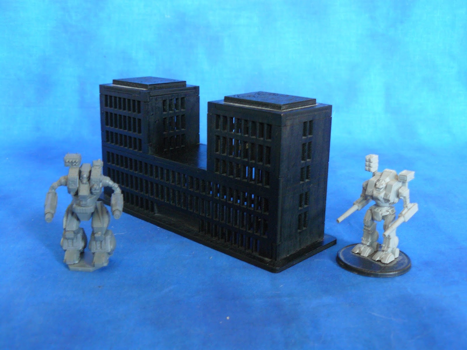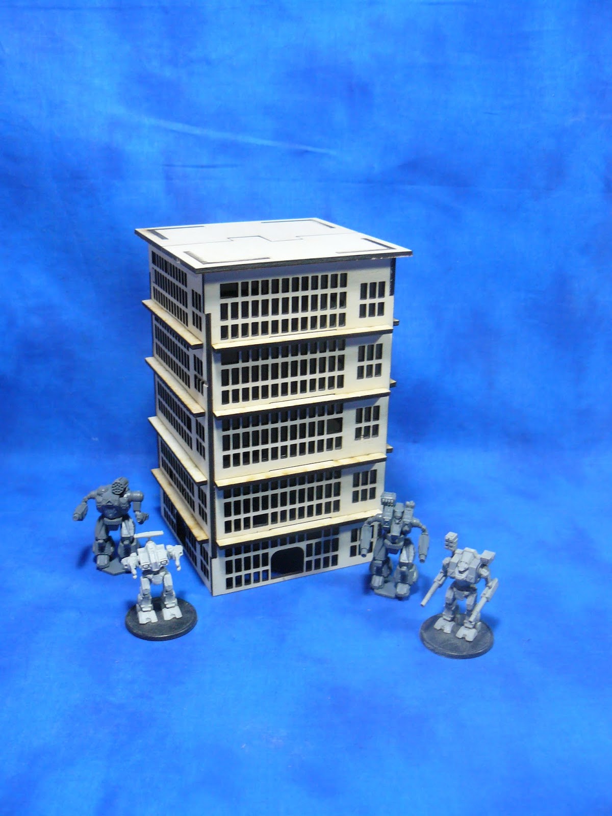 The Administration building is a 2 level building with a twist. The large lower level has plenty of room for placing mechs on top of it while still granting cover. The upper section brings the total story count to 9 making it tall enough to block some flyers.
